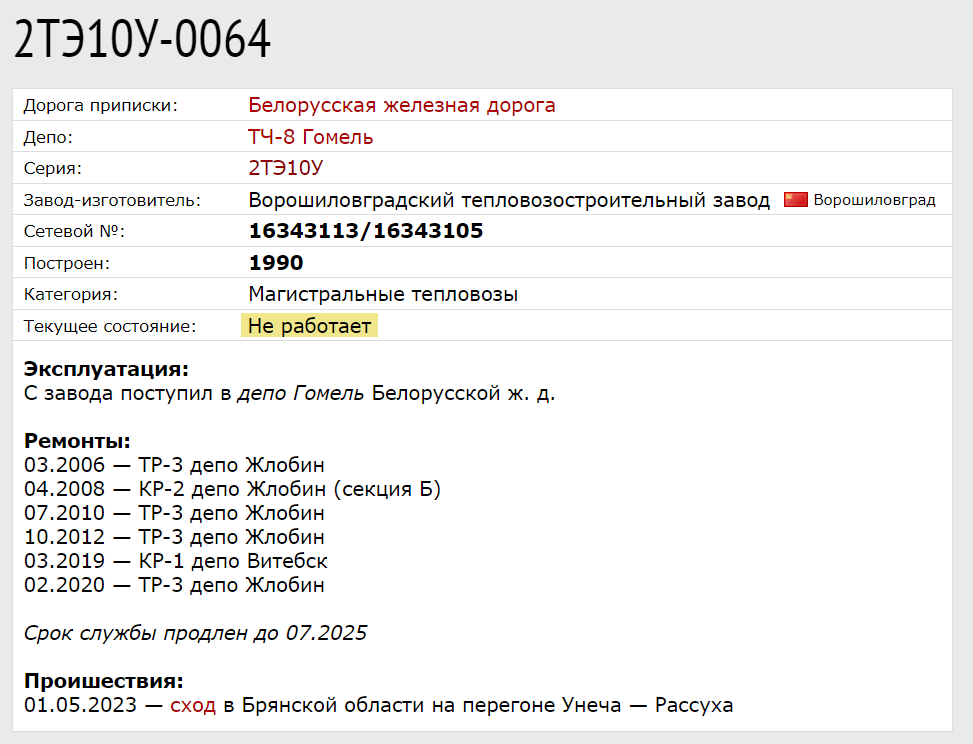 По уточнённой информации тепловоз, подорванный на 136 километре перегона Унеча — Рассуха, серии 2ТЭ10У №064 (сетевой №:16343113/16343105). Депо приписки: ТЧ-8 Гомель Белорусской железной дороги.